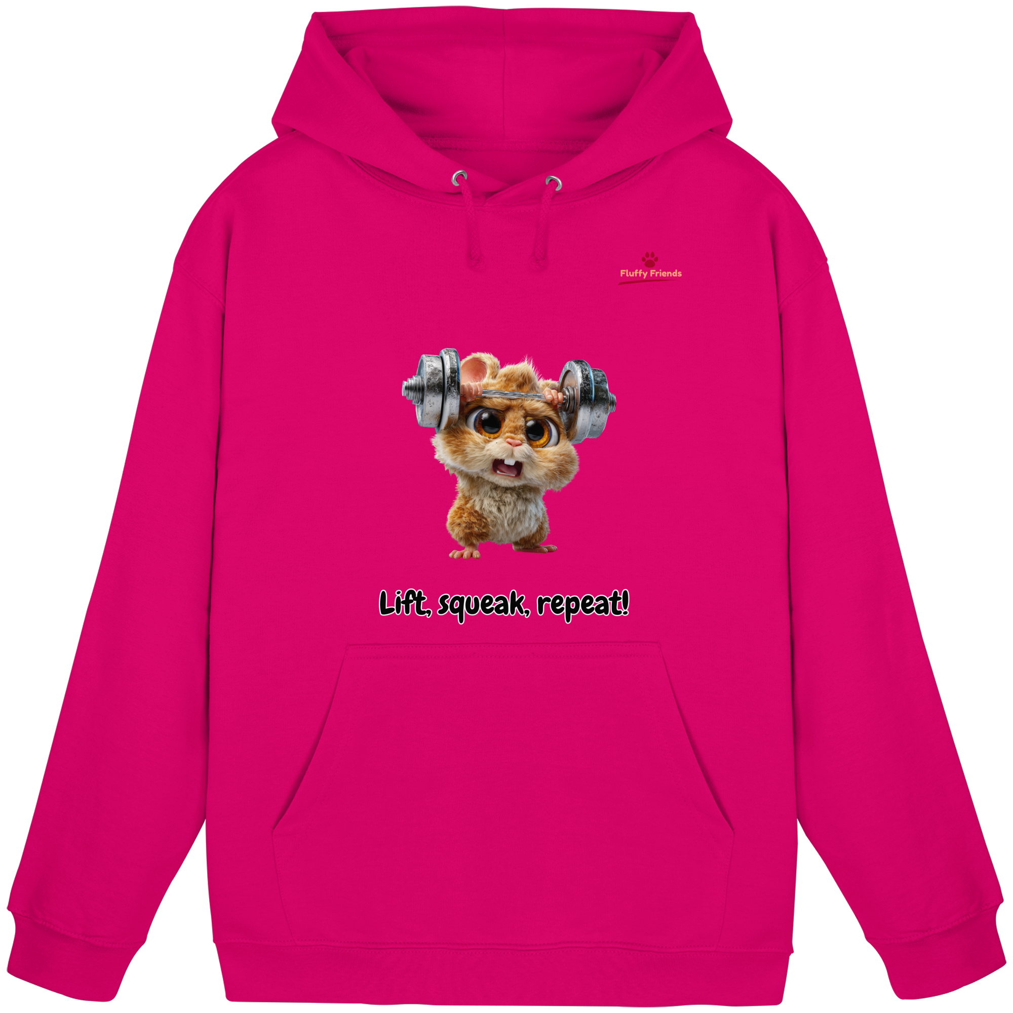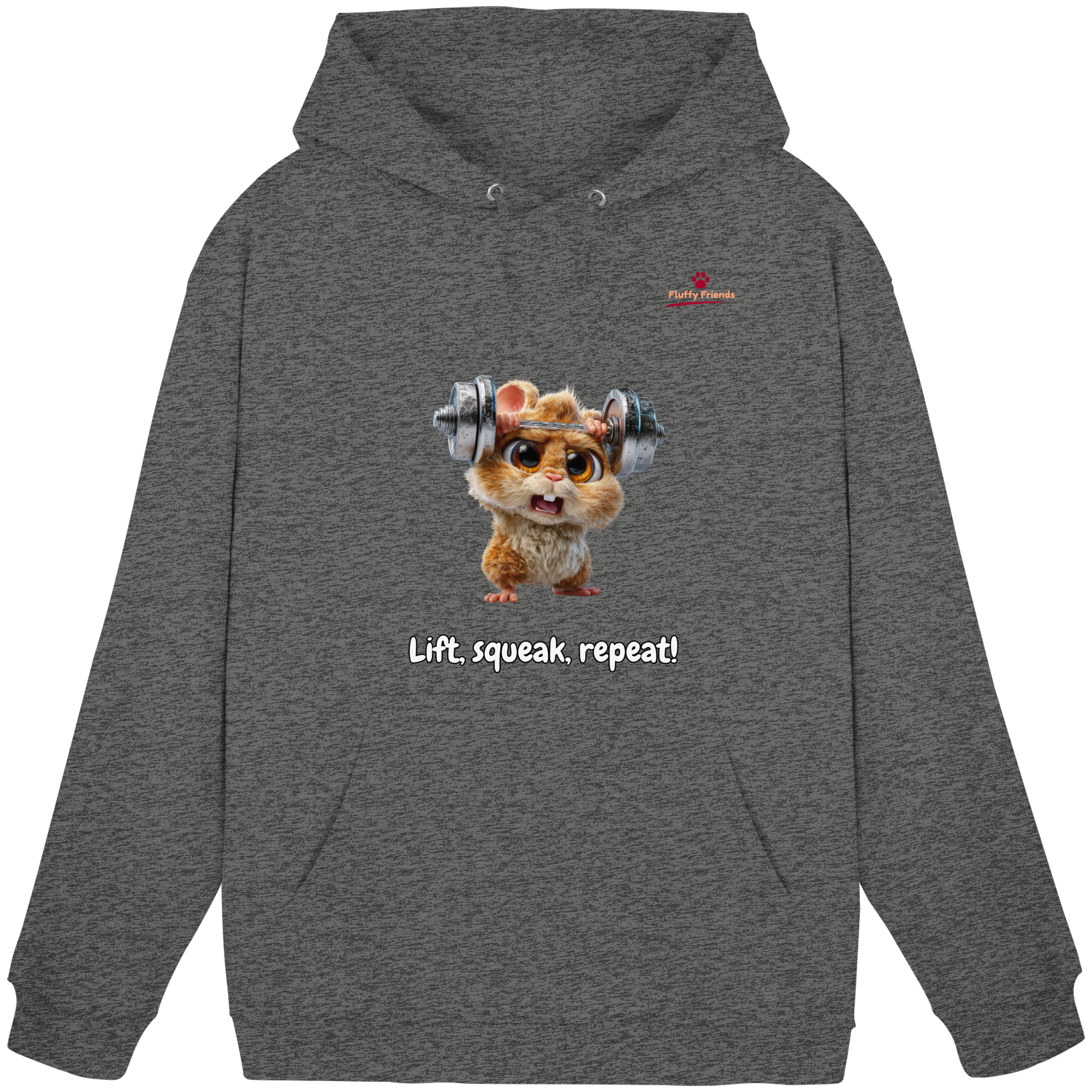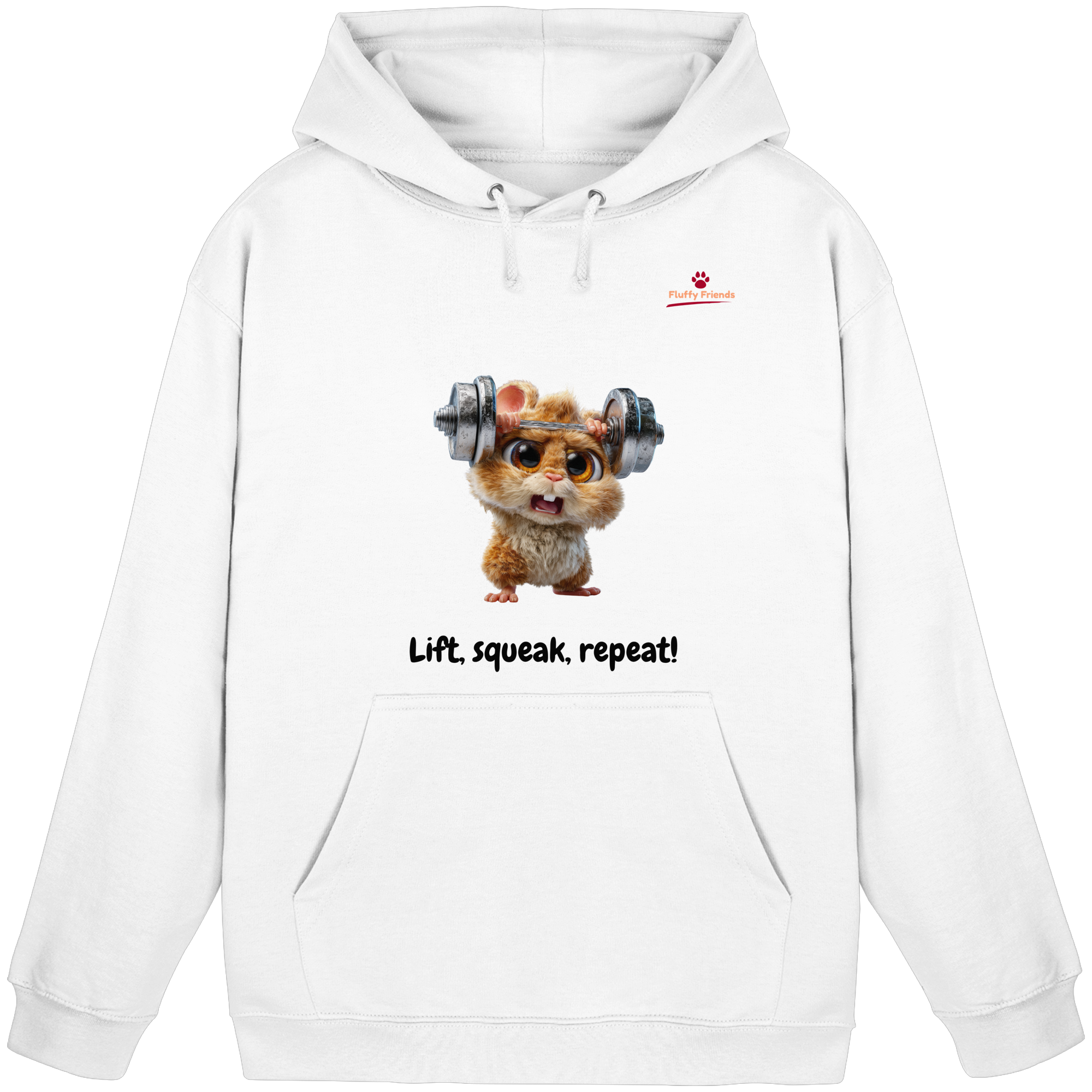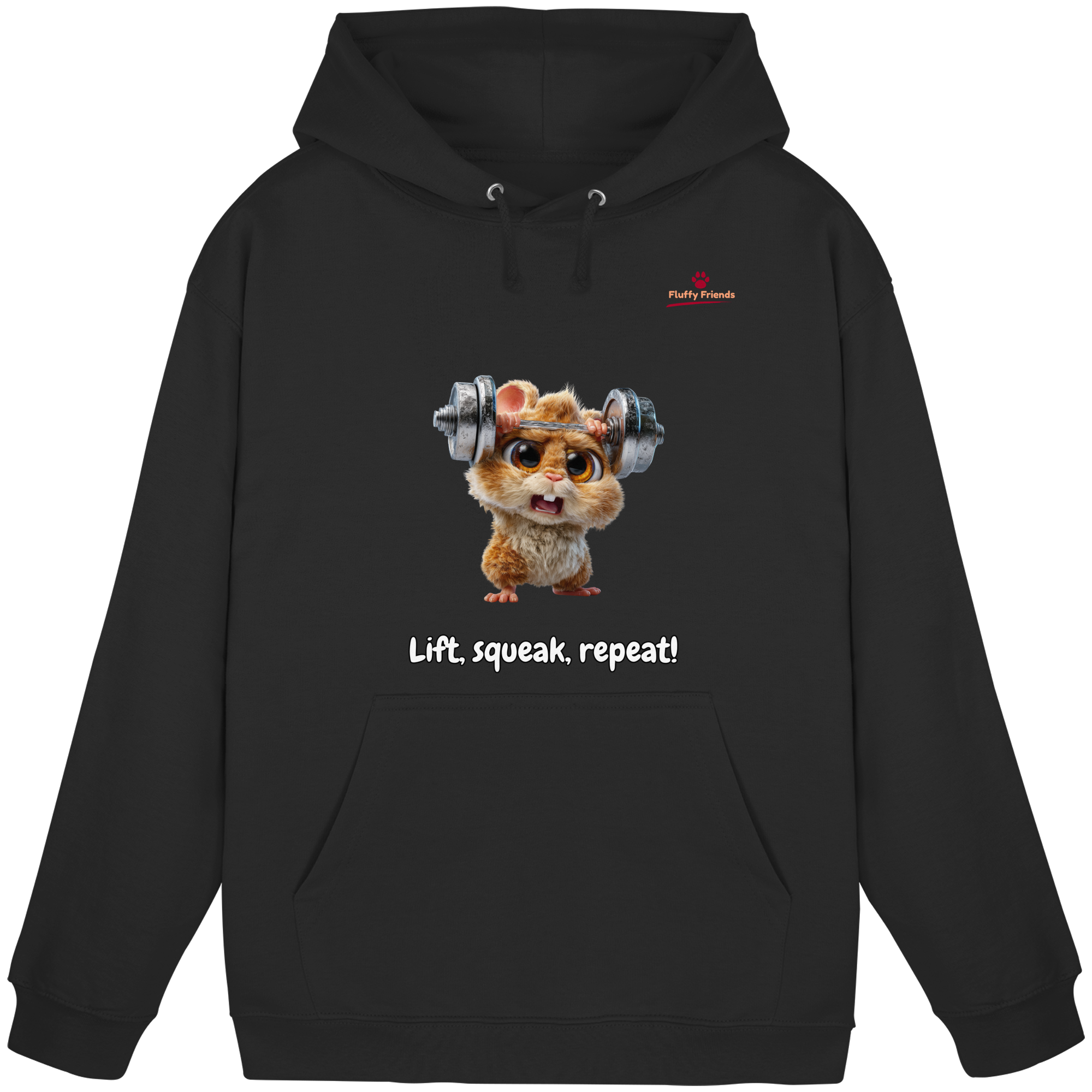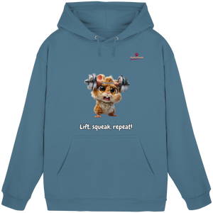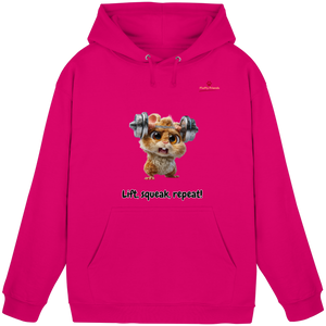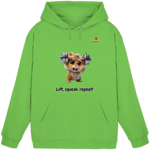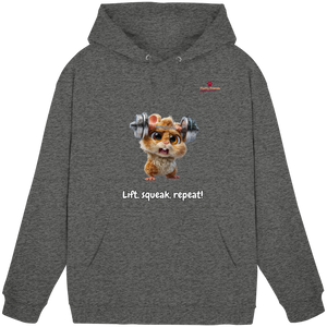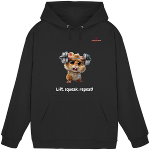 Entfessle deine innere Stärke mit der "Lift, squeak, repeat!" – Hamster Hoodie. Dieser niedliche und dennoch kraftvolle Begleiter aus der FluffyFriends-Kollektion inspiriert mit Humor und Entschlossenheit.