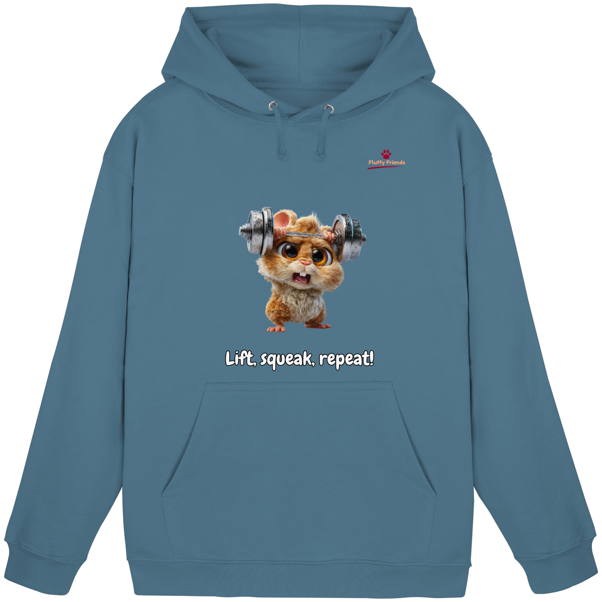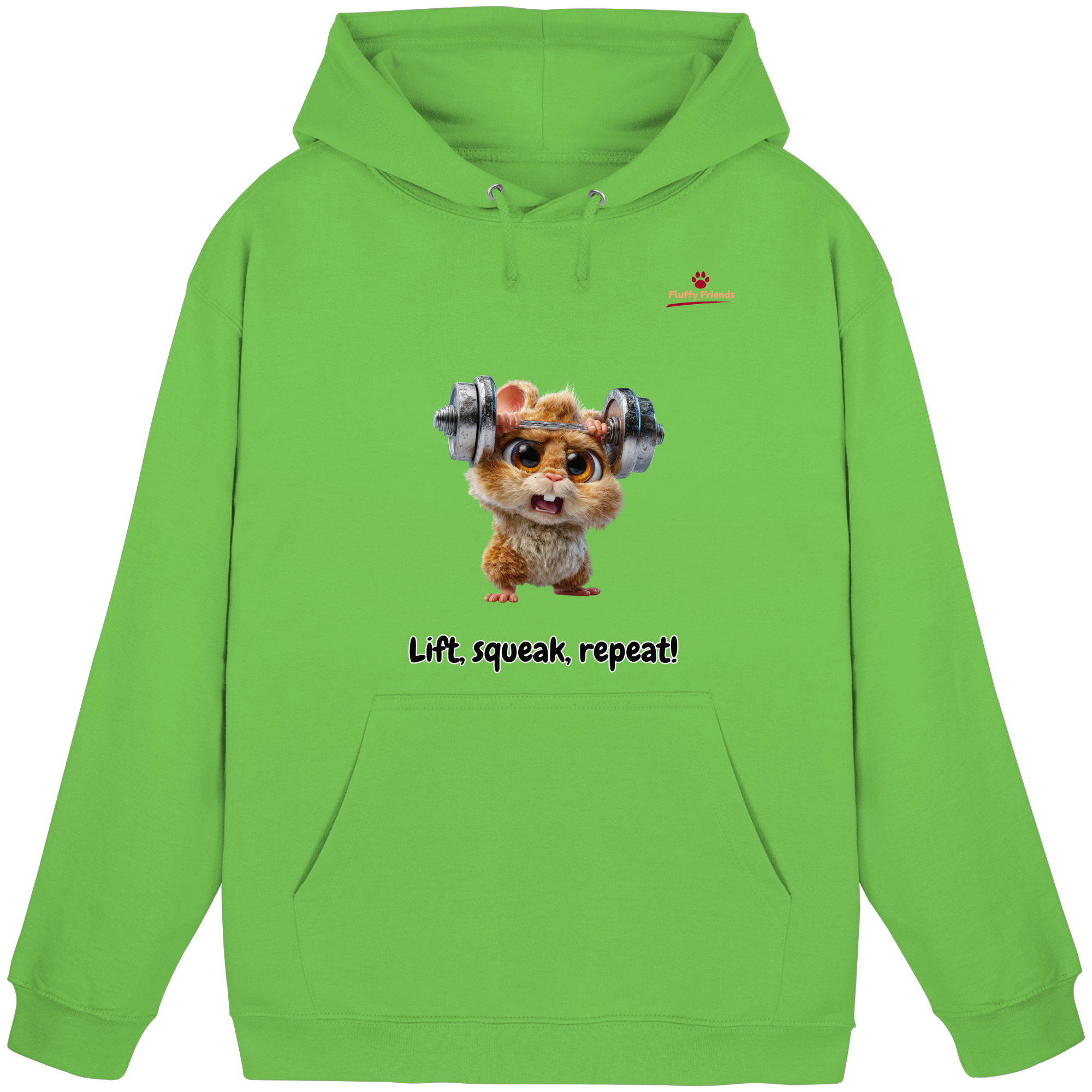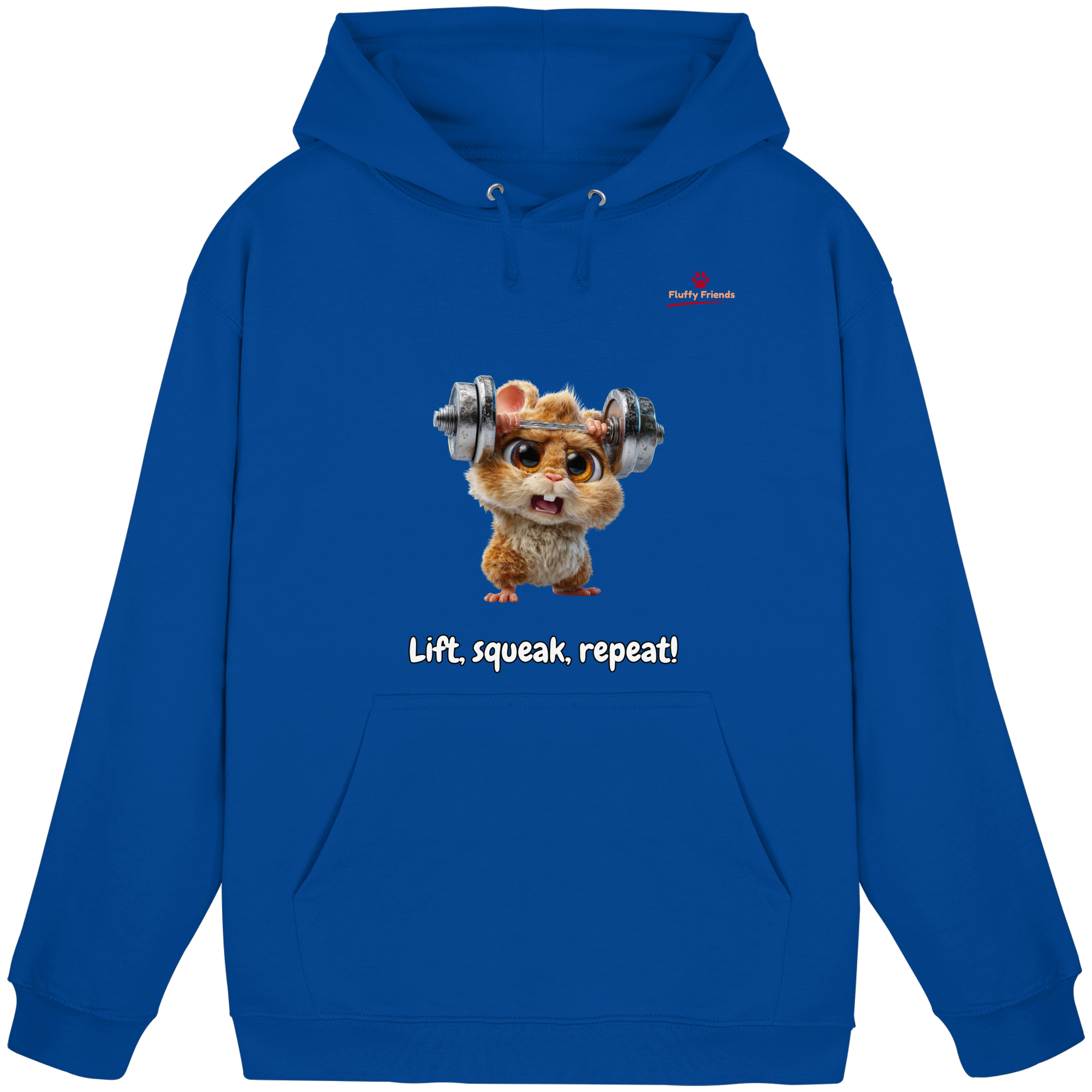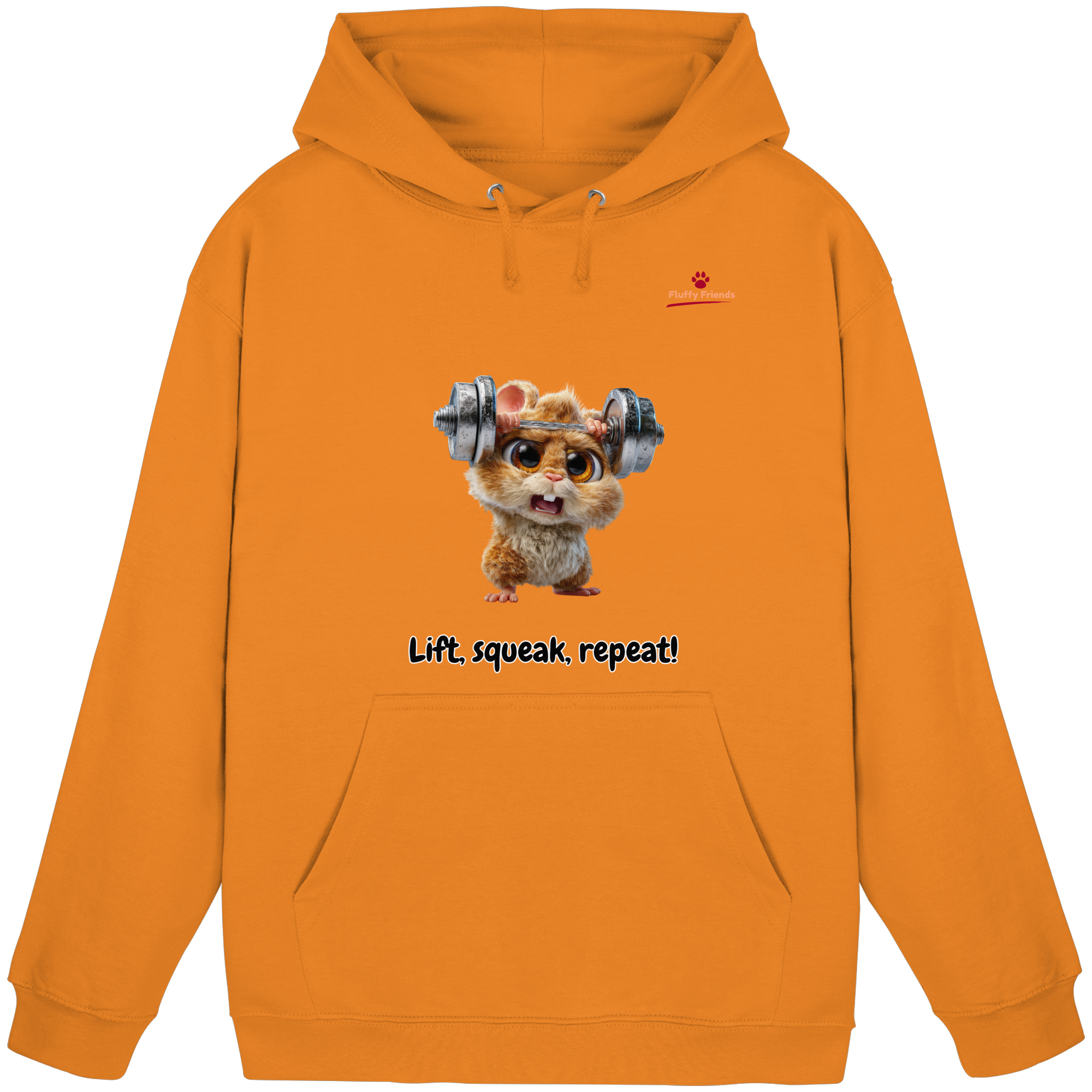 Entfessle deine innere Stärke mit der "Lift, squeak, repeat!" – Hamster Hoodie. Dieser niedliche und dennoch kraftvolle Begleiter aus der FluffyFriends-Kollektion inspiriert mit Humor und Entschlossenheit.