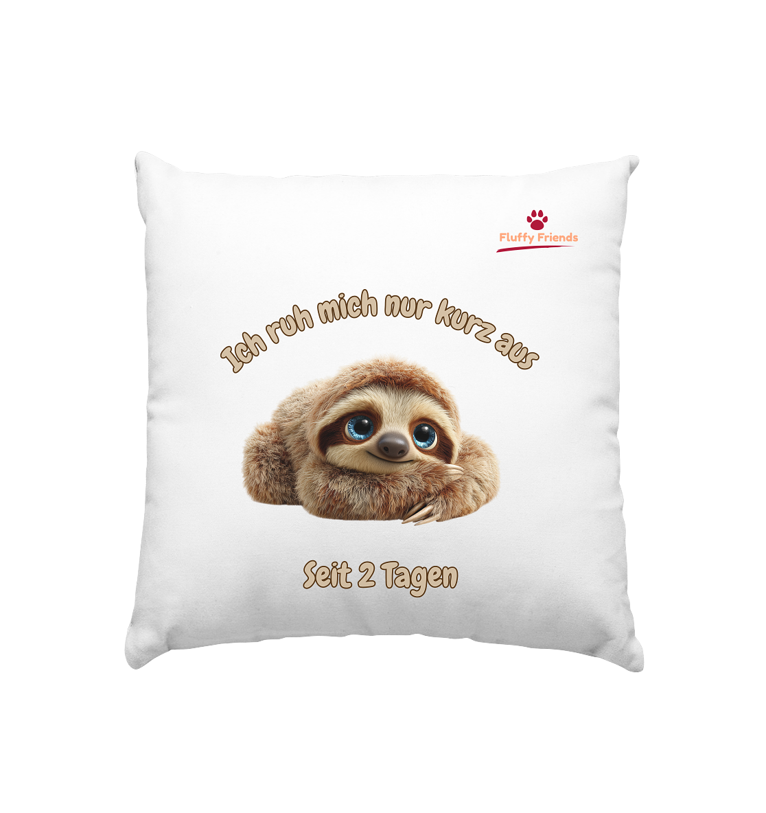 Das Kissen zeigt ein niedliches Faultier mit dem Spruch „Ich ruh mich nur kurz aus – Seit 2 Tagen“. Die sanften Brauntöne harmonieren wunderbar und vermitteln ein Gefühl von Ruhe und Geborgenheit.