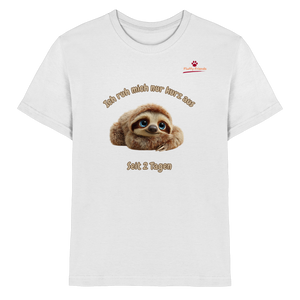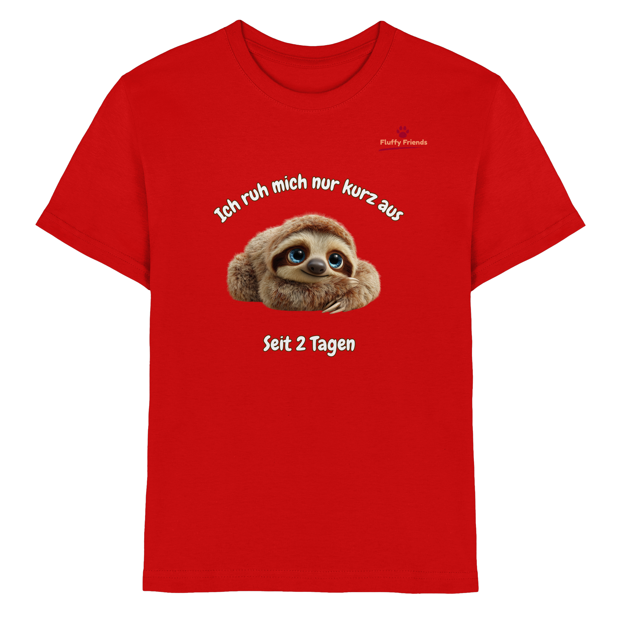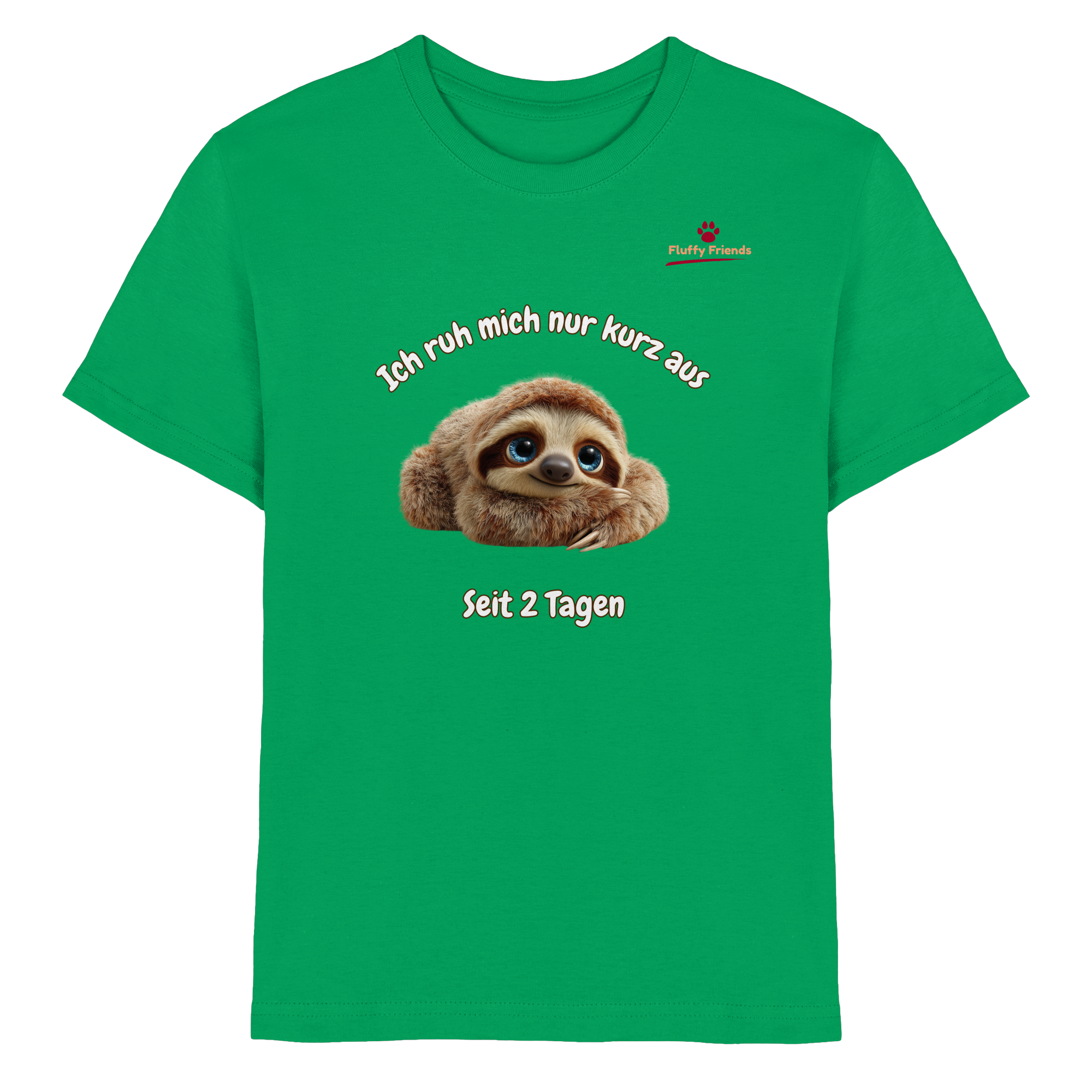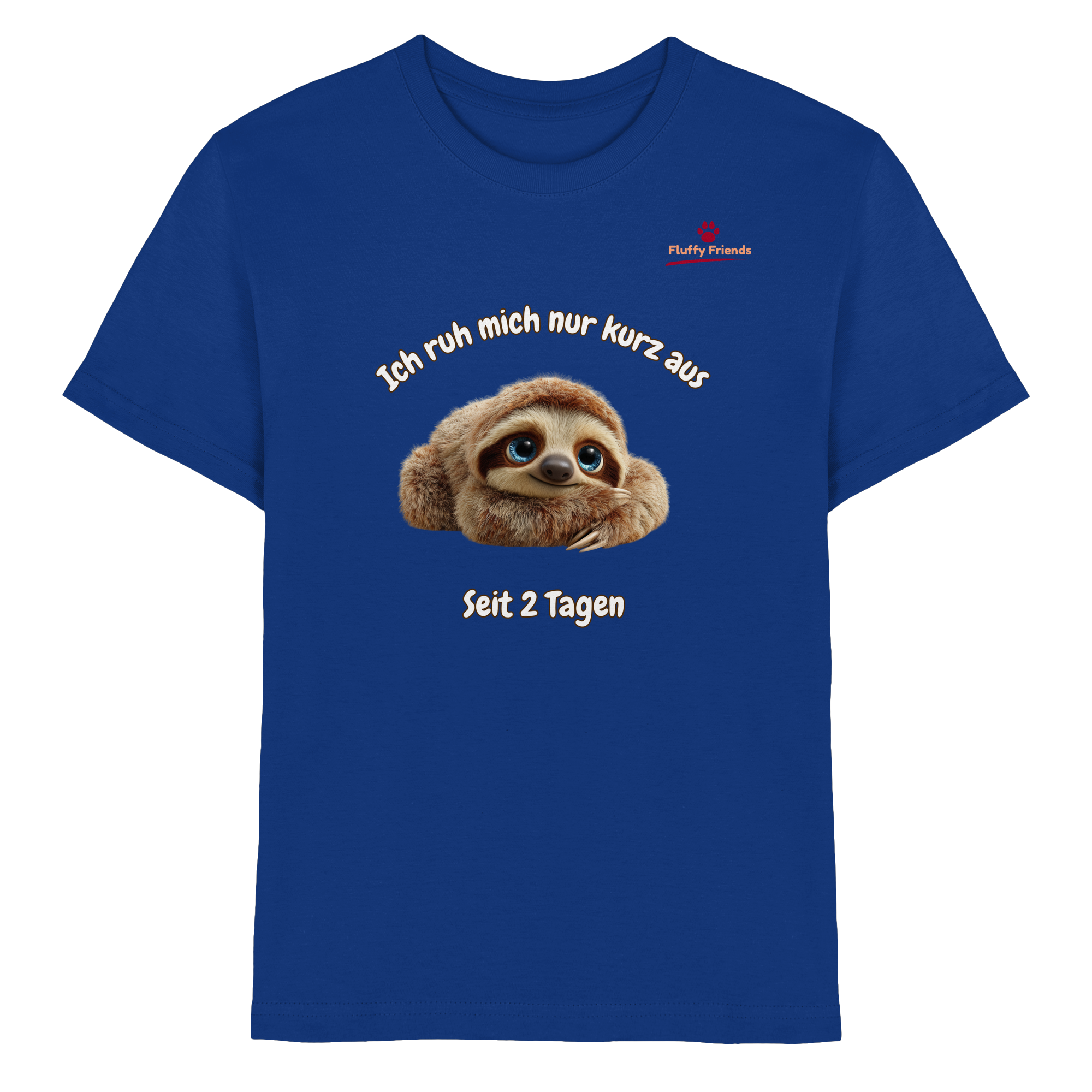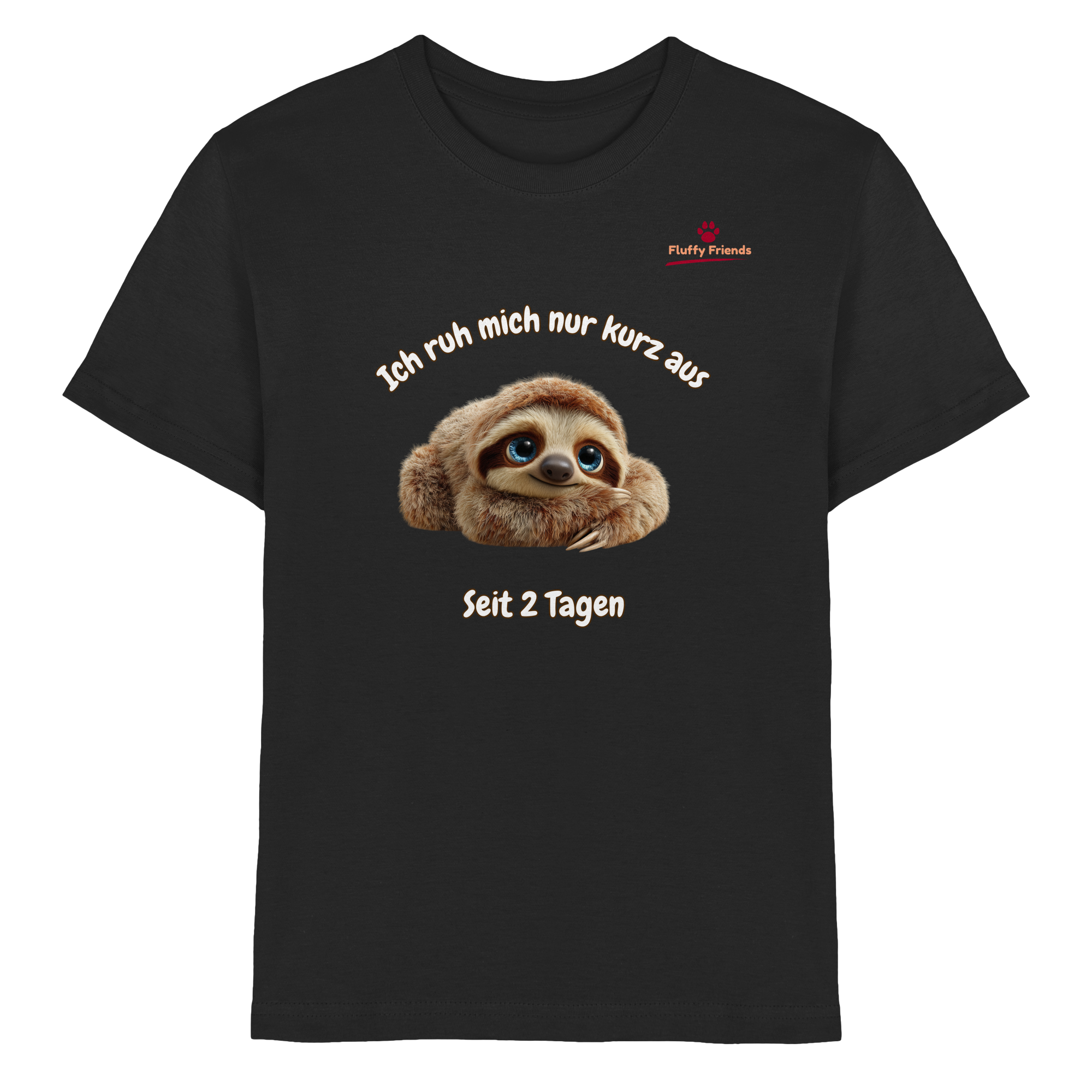 Dieses FluffyFriends-Design vereint Humor und Gemütlichkeit mit einem süßen Faultier und dem Spruch: "Ich ruh mich nur kurz aus – Seit 2 Tagen". Perfekt für kleine Entdecker, die Pausen lieben!