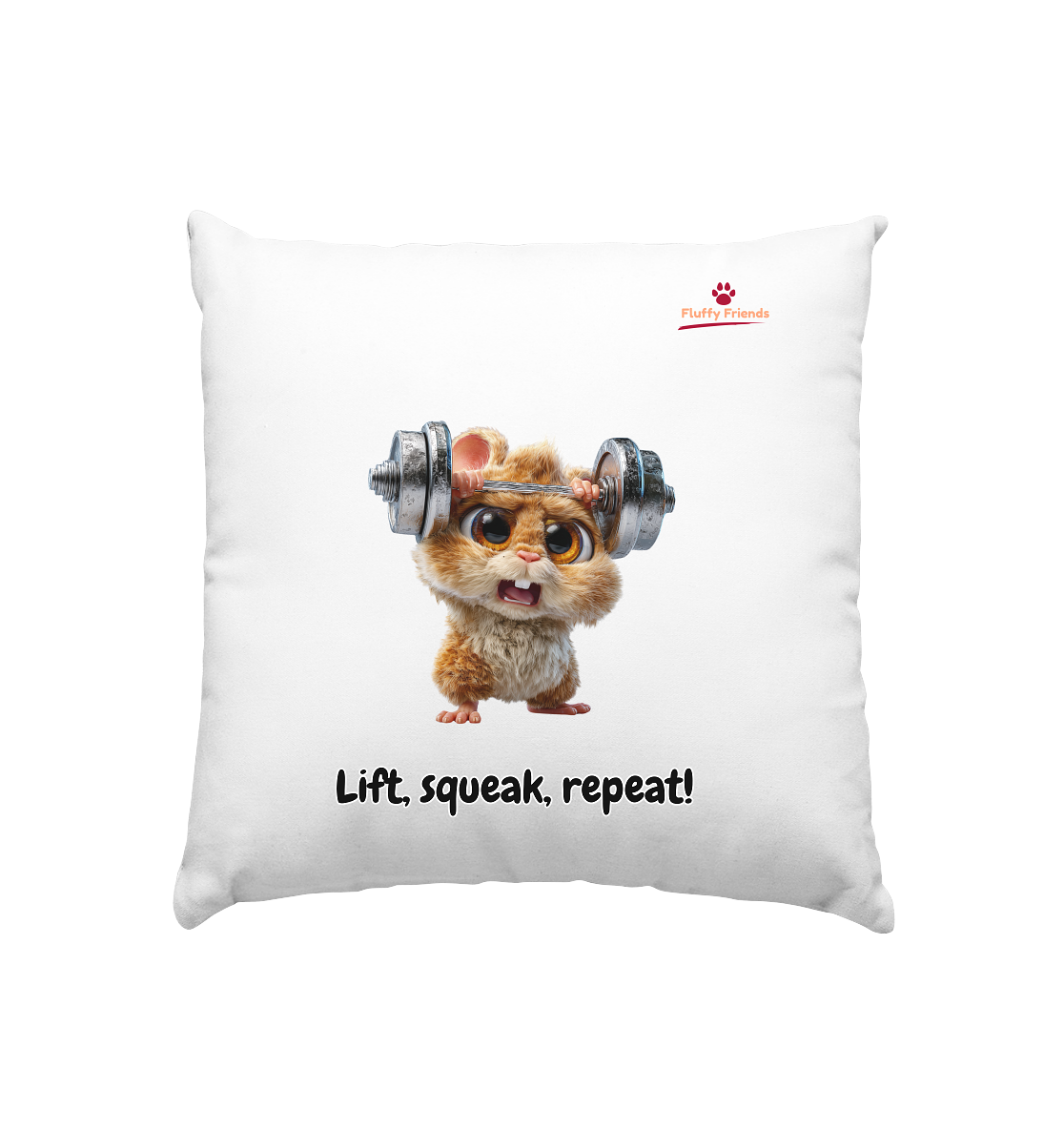 Erlebe die perfekte Kombination aus Motivation und Humor mit unserem „Lift, squeak, repeat!“-Hamster-Kissen. Teil der beliebten FluffyFriends-Kollektion, zeigt dieser entschlossene Fitness-Hamster, dass wahre Stärke in jedem steckt.